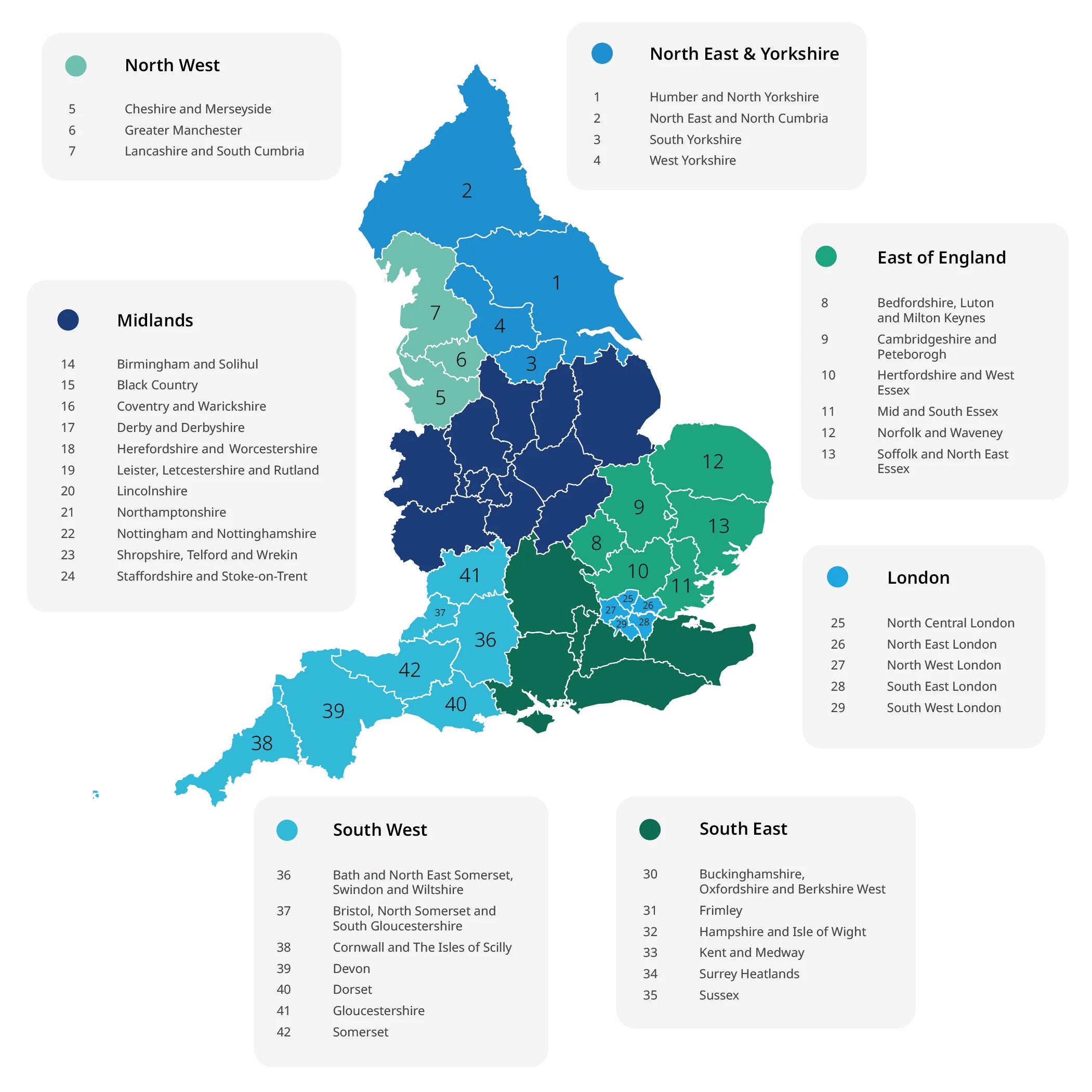 Areas covered by the 42 integrated care boards (and integrated care systems) across England.