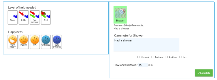 If a resident has a shower, the carer can then press the shower icon listed on the Care Delivery App. When they do so, this will pre-populate the progress note which will allow the carer to add more detail if they want to or if they think it would be necessary. This presents a unique opportunity to develop and adapt care in real-time based on the resident’s needs and preferences because the carer can also input the level of help that was needed and whether the resident was happy or not using the icons below to the left.